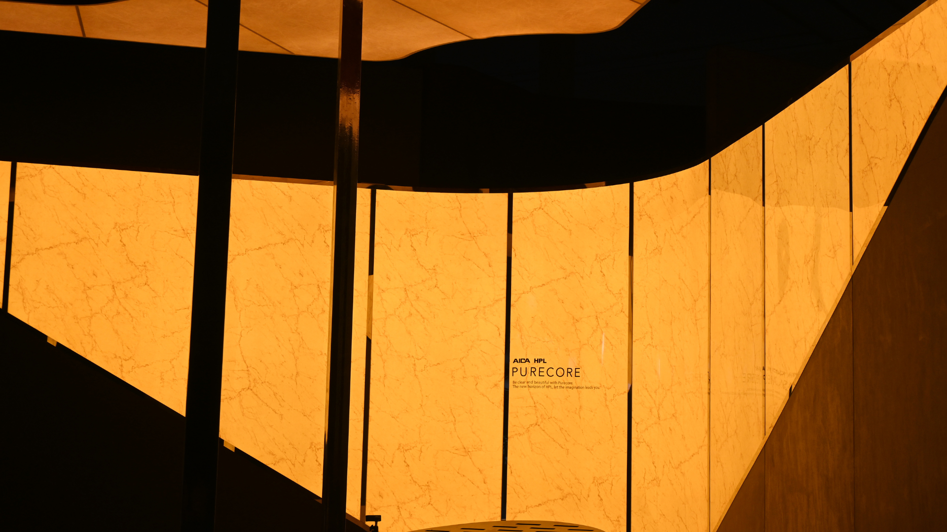 The material also featured on the booth’s ceiling in a striking design inspired by the Indonesian flag, using red solid-color HPL alongside the glowing onyx pattern. Its easy installation and visual impact captured the admiration of architects and designers, sparking questions and inspiration.