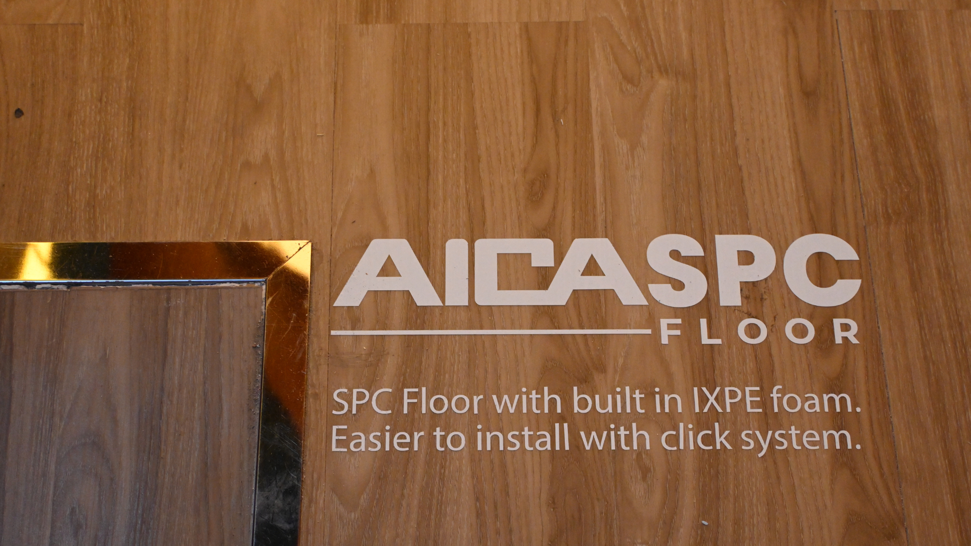 พื้นบูธในงานก็มีการใช้วัสดุ AICA-SPC Flooring ซึ่งผลิตจากส่วนผสมของผงหินและเรซิน PVC ให้ความแข็งแรงและอายุการใช้งานที่เหนือกว่าไวนิลทั่วไป พร้อมสัมผัสที่นุ่มสบายเท้า ซึ่งทาง AICA เลือกใช้สีโทนน้ำตาลอ่อนอบอุ่น ช่วยสร้างบรรยากาศที่กลมกลืนและน่าประทับใจ