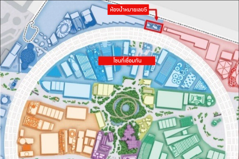 หมายเหตุ: ห้องน้ำหมายเลข 5 ตั้งอยู่บริเวณ “Sky Plaza” ภายในโซนที่เชื่อมกัน ทางเหนือของพื้นที่จัดงาน