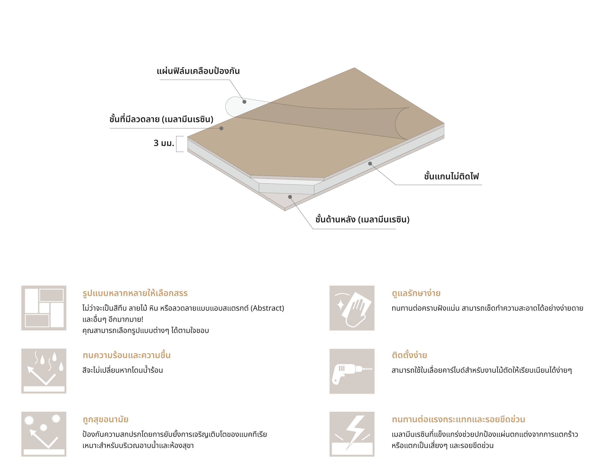 วัสดุตกแต่งผนังที่มีคุณสมบัติการกันลามไฟผลิตจากแผ่นตกแต่งที่เคลือบด้วยเมลามีนเรซินและแกนกลางที่ทำจากวัสดุที่ไม่ติดไฟโดยเฉพาะ ซึ่งขึ้นรูปด้วยอุณหภูมิและแรงดันสูง